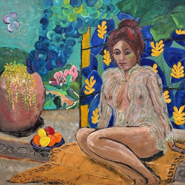 In het kader van de TV-serie 'Op zoek naar Matisse' heb ik aan de prijsvraag meegedaan. Mijn doek 'Femme en satin' herbergt diverse items uit het artistieke werk van Matisse. Zoals daar zijn een (gekuisd) model op kleed,  een kenmerkend (Matisse)landschap op de achtergrond, een schaal met fruit, en een kamerscherm in het motief van het glas in lood van de kapel in Vence.